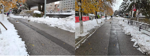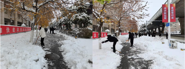 随着时间的推移,扫雪队伍越来越大,每个人自觉领上一把铁锹,迅速在雪地中寻找一处位置,闷头就干。经过两天的堆积,积雪很深、粘度很大,扬不出,推不动,同志们就一锹一锹地端。扫雪队伍中不仅有年轻人,也有老同志,不仅有男同志,也有女同志,每个人都默默除雪,全力攻坚,清理出一处,又转战下一处,有人在前开路,有人在后铲雪,配合默契,有条不紊,看似厚厚的积雪,渐渐向两侧分开,露出雪藏的地面。